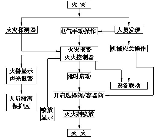 當兩種探測器發(fā)出火災信號時,控制主機啟動警鈴和聲光報警器,聯(lián)動關閉防護區(qū)開口,進入滅火啟動延時,達到設定的延時時間后,自動啟動滅火系統(tǒng)。